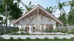 Mặt tiền có cột đỡ mái được cách điệu từ hình thân cây tạo nên điểm nhấn tinh tế thú vị, giúp căn nhà thêm phần hòa nhập với cảnh quan cây xanh xung quanh. Các hệ cửa kính khung gỗ mang lại nét đẹp hiện đại. Các diện kính lớn giúp lấy sáng tối đa vào nhà. Màu sơn trắng kết hợp với mái ngói đỏ trở nên nổi bật giữa màu xanh của cây cỏ. Hệ mái ngói với phần đua ở các phía giúp che chắn các tác động xấu từ môi trường vào ngôi nhà.
