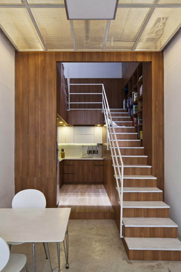 Các không gian chức năng bên trong rất linh hoạt. Nhà bếp, nhà vệ sinh, nhà kho, cầu thang và kệ sách mở thông mới nhau như một chiếc hộp lớn đa chức năng rộng 3x3m.