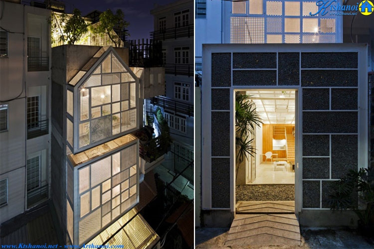 Mau nha pho dep mặt tiền hai lớp gồm lớp bê tông bên ngoài với những ô vuông nhỏ và lớp kính vững chắc phía sau. Trần nổi và ánh sáng cũng đóng góp vào sự tương tác không gian, mang đến nhiều nắng và gió tự nhiên. Các khoảng trống nội bộ giữa các tầng giúp giữ cho một kết nối giữa bên trong và bên ngoài, ngay cả khi các cánh cửa được đóng lại.