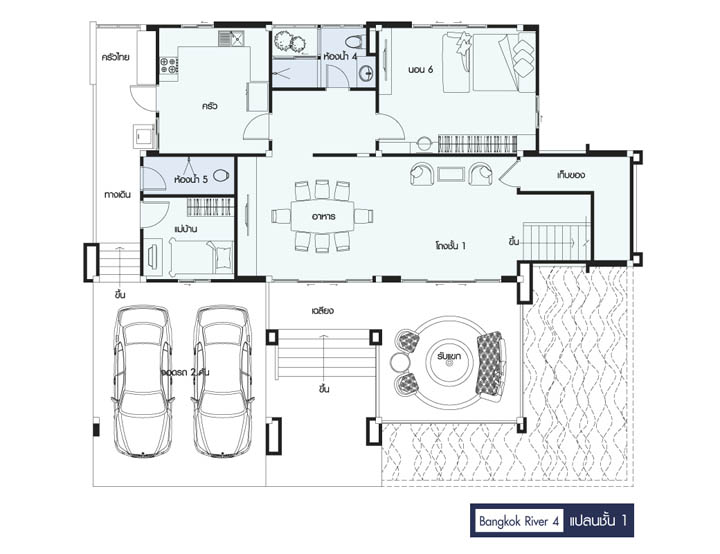 Mặt bằng bố trí nội thất tầng 1: Một hồ nước lớn được bố trí ở trước và mặt bên của biệt thự. Phòng khách được thiết kế hiện đại trước không gian chính, nơi xung quanh là hệ sân vườn và bể nơi hiện đại. Sâu vào trong là không gian phòng ăn rộng rãi. 1 phòng ngủ bếp và phòng cho người giúp việc