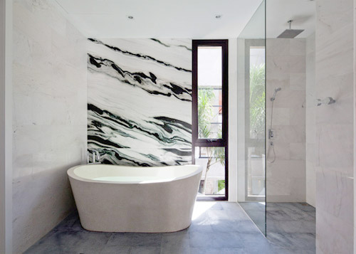 Phòng tắm kín đáo nhưng vẫn tràn đầy ánh sáng tự nhiên qua ô kính dài hẹp.