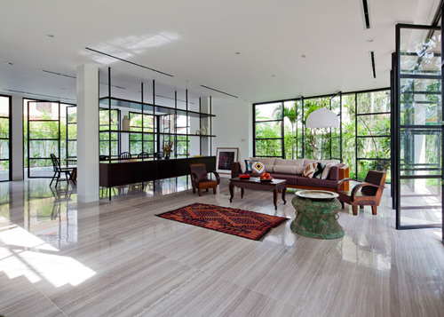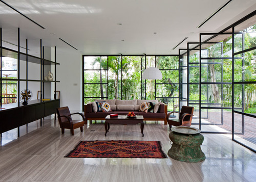 Với tiêu chí “đưa cây vào nhà”, phòng khách, phòng ăn và bếp của tầng trệt được thiết kế cửa kính để tạo nên một không gian hoàn toàn mở và thông suốt với khu vườn từ trong ra ngoài.